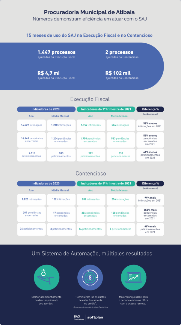 A procuradora do município de Atibaia, Patrícia Lima, credita o cenário observado a dois fatores. “No começo [do uso do SAJ], recebemos muitas intimações que estavam paradas. Mais de 6 mil intimações”, diz. Parte dessas intimações já haviam sido cumpridas, segundo Lima, mas não tiveram baixa no Tribunal de Justiça. Por isso, em 2020 o número de intimações foi maior e percebeu-se uma diferença grande na comparação com 2021.