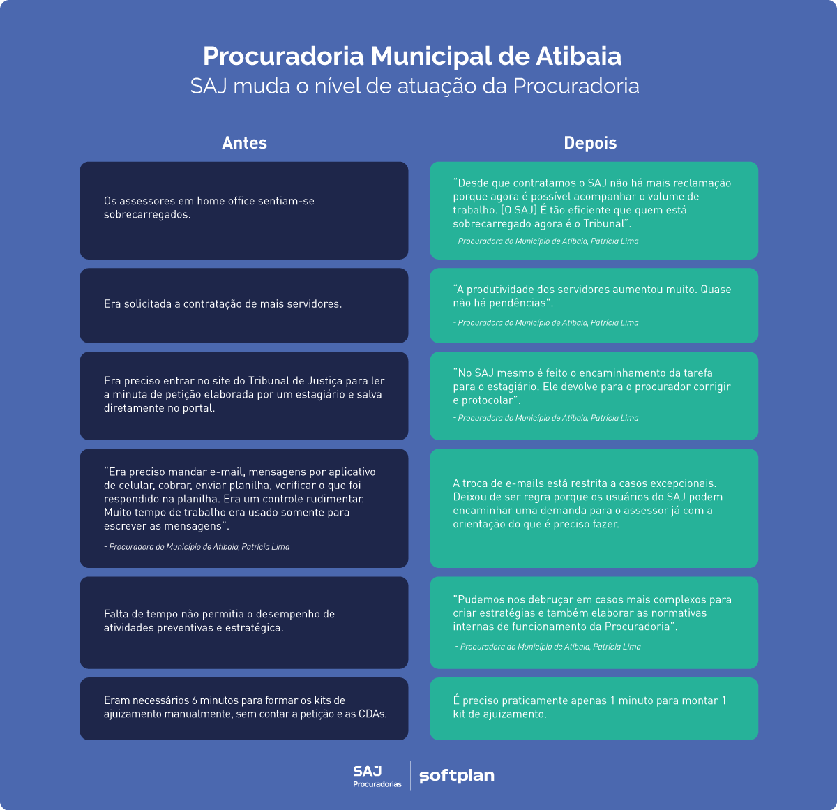 A implantação do SAJ na Procuradoria de Atibaia eliminou do dia a dia da instituição algumas situações percebidas como entraves para o melhor desempenho das atividades dos procuradores. Por exemplo, a necessidade de identificar as tarefas prioritárias manualmente, cada um na sua planilha. “Isso gerava um problema grande em relação ao controle dos prazos porque era [um jeito de atuar] muito precário”, afirma a procuradora Patrícia Lima.